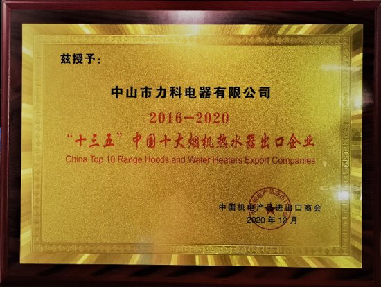 會議期間舉辦了“十三五“中國(guó)電子(zǐ)家電産品出口百強企業發布儀式。中山市(shì)力科(kē)電器有(yǒu)限公司憑借出口情況、行(xíng)業貢獻、品牌建設、經營規模、社會責任等多方面因素被中國(guó)機(jī)電産品進出口商(shāng)會認定在2020年(nián)出口成績保持行(xíng)業領先。經主辦方評選,中山市(shì)力科(kē)電器有(yǒu)限 公司榮為(wèi)2020中國(guó)十大煙機(jī)及熱水器出口企業!